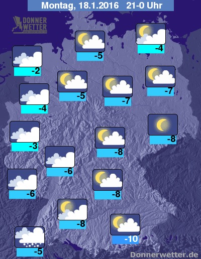 Heute Abend ziehen in den westlichen Landesteilen zunehmend dichte Wolken auf, dabei kann es im Breisgau gegen Mitternacht schneien, sonst bleibt es jedoch weitgehend trocken. Im übrigen Bundesgebiet zeigt sich der Himmel locker bewölkt oder auch sternenklar, dazu bleibt es trocken. Die Abendtemperatur liegt bei -2 Grad an der Nordseeküste und um -10 Grad in München.