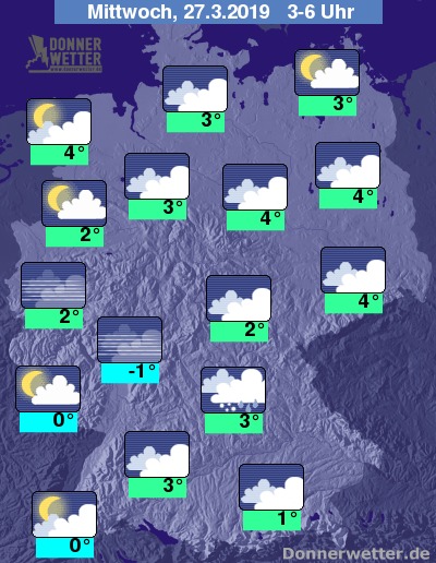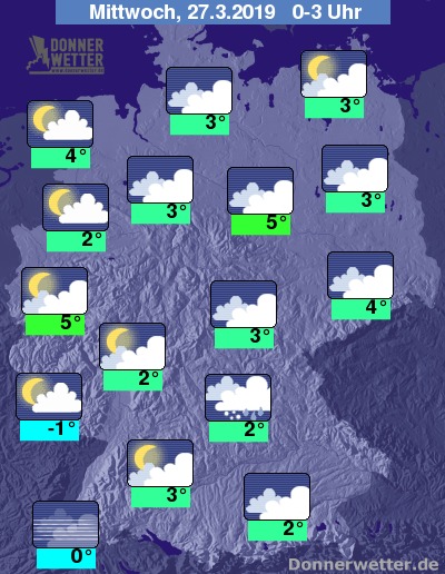 In der kommenden Nacht überwiegt im Osten eine meist geschlossene Wolkendecke. Vor allem in der Westhälfte kann es auflockern. Niederschläge sind meist nicht zu erwarten,  nur in Franken kkönnen zeitweise eintelne Schneeregen- oder Regenschauer fallen. Im weiteren Nachtverlauf kann sich gebietsweise Nebel bilden.