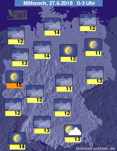 In der Nacht ist es meist klar oder hochnebelartig bewölkt, lockere Wolken, die aber keinen Regen bringen, finden sich am ehesten am Alpenrand.