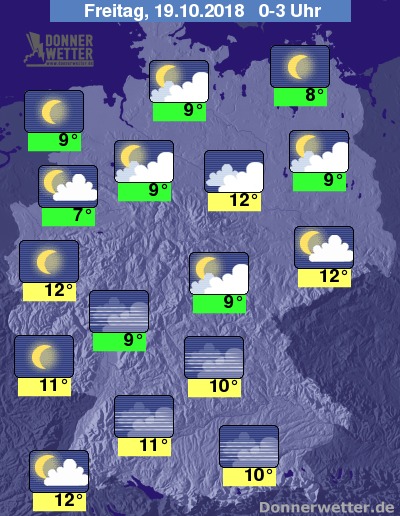 In der Nacht ist der Himmel über der Nordosthälfte überwiegend wechselnd oder stark bewölkt, in den übrigen Landesteilen breitet sich im Nachtverlauf flächendeckend Nebel oder Hochnebel aus. Schauer sind nicht zu erwarten.