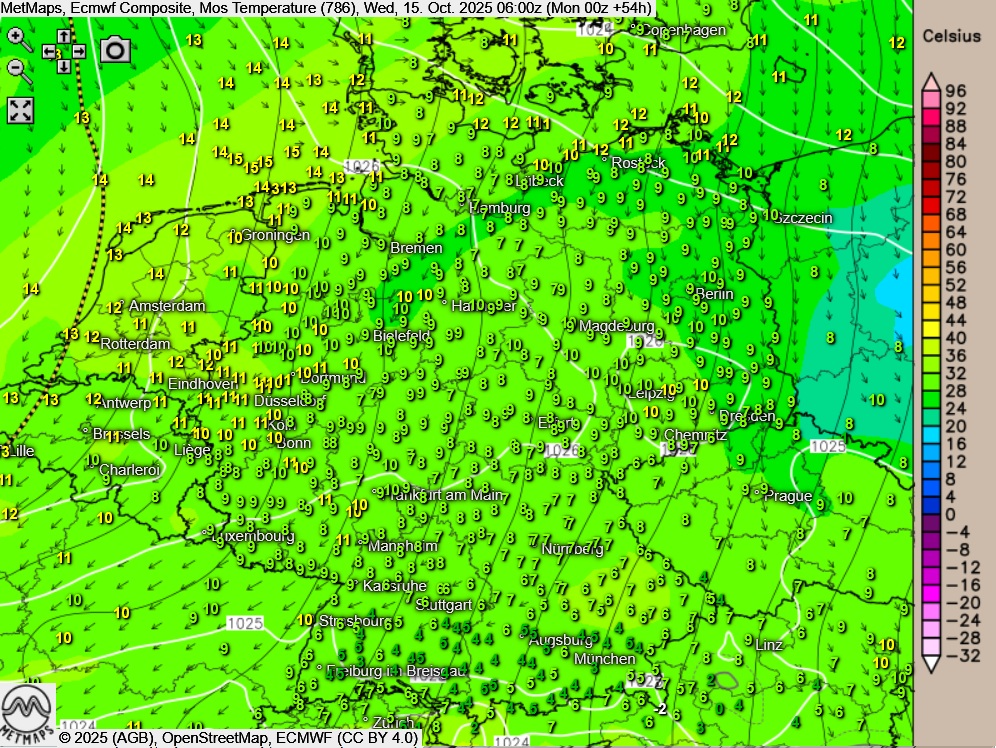 Die Strömungs- und Temperaturkarte sowie die Wetterkarte für Mittwochfrüh (06:00 Uhr) nach Ecmwf: