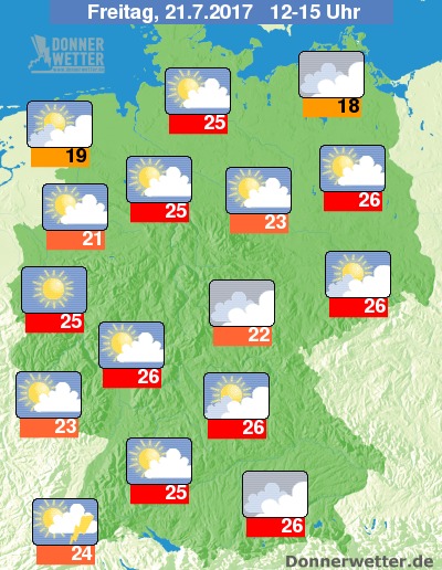 Im Lauf des Nachmittags breiten sich die Gewitter dann über die gesamte Südhälfte des Landes aus, während es im Norden weiterhin recht sonnig bleibt.
