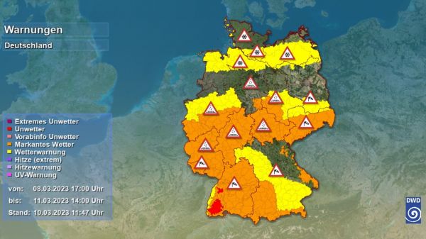 Für den äußersten Südwesten gilt eine Unwetterwarnung vor orkanartigen Böen zwischen 100 und 115 km/h. In exponierten Lagen sind Orkanböen um 130 km/h möglich.