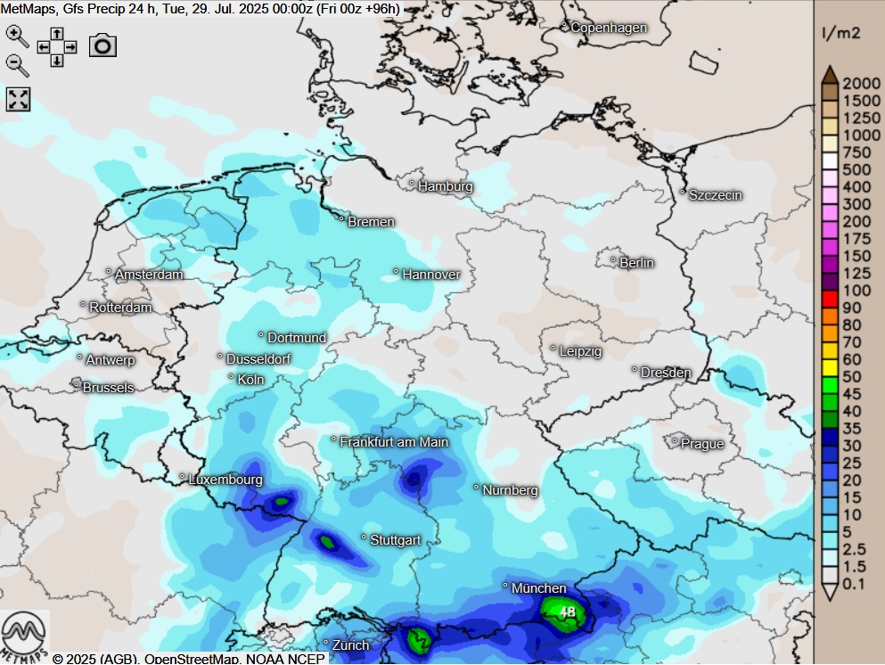 Am Montag zeigt sich der Himmel meist wechselnd oder stark bewölkt, dabei fällt im Tagesverlauf vor allem südlich der Donau teils schauerartiger Regen, auch lokale Gewitter mit Starkregen sind möglich. Weitgehend niederschlagsfrei bleibt es am Montag im Norden und Osten Deutschlands.