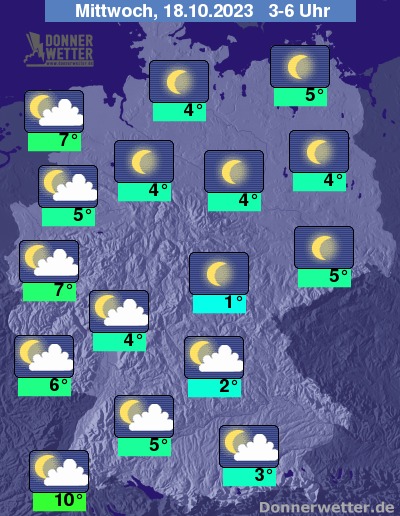 In der bevorstehenden Nacht ist der Himmel zunächst verbreitet sternenklar. Im weiteren Nachtverlauf ziehen in den Süden und Westen einige, meist lockere Wolkenfelder, dazu bleibt es trocken. Die Temperatur sinkt auf 10 Grad in Freiburg und bis 1 Grad in Jena.