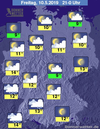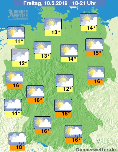 Am frühen Abend liegen die Temperaturen meist zwischen 11 und 18 Grad. Am kühlsten ist es dabei an der Ems, am mildesten im Breisgau.