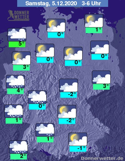 Während der zweiten Nachthälfte nehmen die Niederschläge vom Oberrhein und Schwarzwald her wieder zu und fallen in höheren Lagen meist als Schnee oder Schneeregen, dabei muss mit Glätte gerechnet werden. Auch im Emsland kann es zwischendurch mal tröpfeln. Im übrigen Land bleibt es teils stärker bewölkt, teils aufgelockert. Nach Osten hin kann man Mond und Sterne auch mal für längere Zeit beobachten.