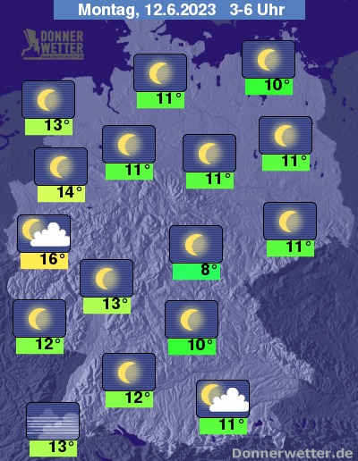 In der Nacht zum Montag ist es anfangs noch hier und da locker bewölkt, jedoch klart der Himmel über dem gesamten Bundesgebiet auf. Bei Tiefstwerten von 16 Grad in Köln und bis 8 Grad in Jena bleibt es überall trocken.
