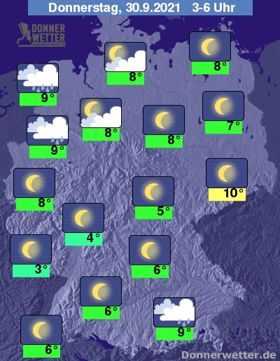 In der folgenden Nacht halten sich im südlichen Bayern, sowie im Nordseeumfeld dichte Wolken aus denen es zeitweise regnet. Im übrigen Bundesgebiet zeigt sich der Himmel hingegen weitgehend sternenklar und es bleibt trocken. Die Temperatur sinkt auf 10 Grad in der Lausitz und etwa 3 Grad im Saargau.