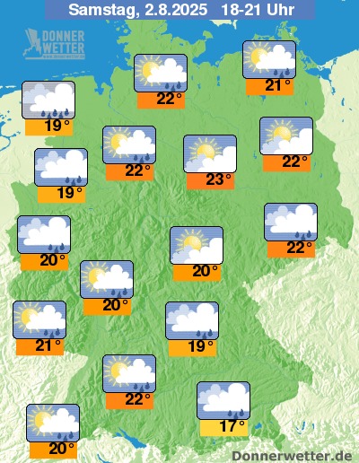 Heute Abend ist es teils dicht, teils aufgelockert bewölkt, dabei bilden sich gebietsweise Schauer, zudem können örtliche Gewitter auftreten. Die Temperatur liegt bei etwa 17 Grad am bayerischen Alpenrand und 23 Grad in der Magdeburger Börde.