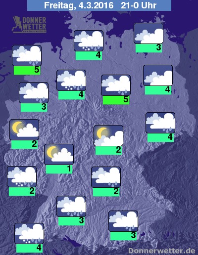 Heute Abend bleibt es über der Bundesrepublik zum Großteil bedeckt, gebietsweise Auflockerungen sind vom Westen bis in die Landesmitte zu erwarten, hier bleibt es auch meist trocken. Im Nordosten und Osten bleibt es bei dichten Wolken ebenfalls weitgehend trocken, sonst fällt jedoch zeitweise Regen, teils auch Schneeregen oder Schnee mit möglicher Glättegefahr! Die Abendtemperatur liegt bei 5 Grad in Ostfriesland und etwa 1 Grad am Taunus.