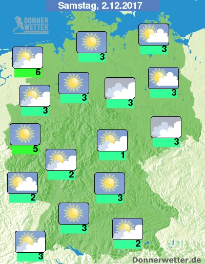 Am Samstag zeigt sich häufig die Sonne und es ziehen, wenn überhaupt meist nur lockere Wolkenfelder durch. Besonders im Osten und am Alpenrand halten sich die Wolken jedoch auch gebietsweise dicht, dazu bleibt es trocken. Die Temperatur steigt nur auf 1 bis 6 Grad.