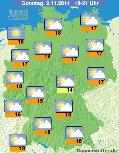 Mit ruhigem, zumeist freundlichem Hochdruckwetter verabschiedet sich das erste Novemberwochenende. Am Sonntagnachmittag und -abend werden dabei noch Temperaturen um 14 Grad C im Thüringer Wald und um 18 Grad im Schwarzwald erreicht.