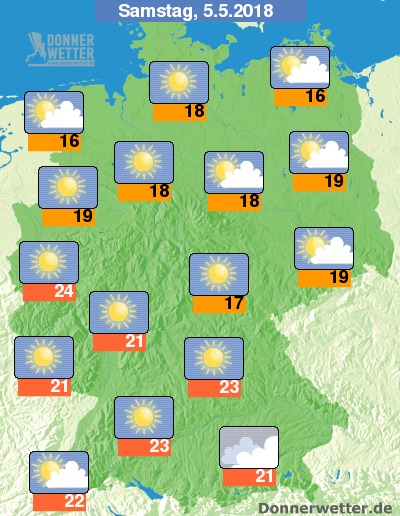 Am Samstag ist es verbreitet heiter oder sonnig, im Alpenvorland ziehen gebietsweise dichte Wolken durch, es bleibt aber trocken. Die Temperatur erreicht 16 Grad auf Rügen und bis 24 Grad im Rheinland.