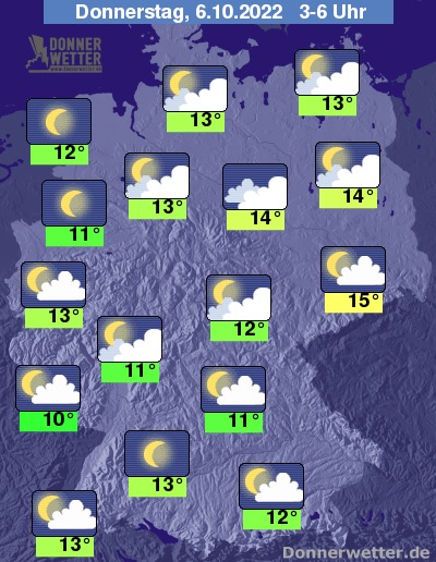 In der Nacht zum Donnerstag ziehen zeitweise dichte Wolken durch, sonst ist es aber auch oft nur gering bis aufgelockert bewölkt. Es bleibt weitgehend trocken bei Tiefstwerten von 15 Grad in Dresden und 10 Grad in Saarbrücken.