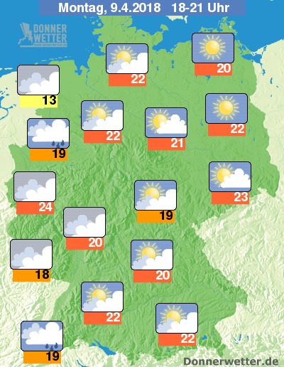 Heute Abend bilden sich über dem Südwesten und regional an Rhein und Ems einzelne Schauer, vereinzelt sich auch Gewitter möglich. Im Südosten, Osten und Nordosten ist es noch meist heiter bis sonnig und trocken. Im übrigen Land ist es teils aufgelockert, oft aber auch schon stark bewölkt, dazu jedoch weitgehend trocken. Die Temperatur liegt bei 13 Grad in Bremerhaven und bis 24 Grad in Köln.