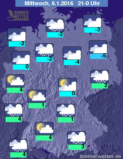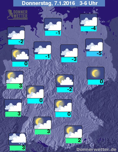 In der Nacht zum Donnerstag sind vor allem im Alpenvorland noch zeitweise Regen, Schneeregen oder Schnee möglich, dabei besteht Glättegefahr! Sonst klingen die Niederschläge jedoch verbreitet ab, vor allem im Norden bleibt es aber meist dicht bewölkt, in den anderen Landesteilen kann es hingegen auch oft auflockern. Die Temperatur sinkt auf 3 Grad im Saargau und etwa -5 Grad in Neubrandenburg. An der Nordsee weht teils starker Wind.