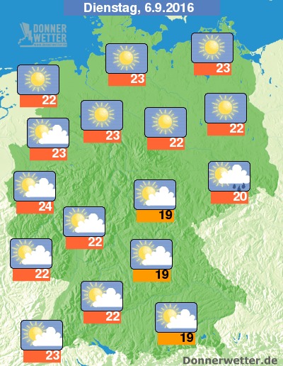 Am Dienstag sind über Sachsen und im äußeren Südosten des Landes noch anfangs letzte Tropfen möglich, sonst scheint über der Republik verbreitet die Sonne bei oft wolkenlosem und sonst nur locker bewölktem Himmel, dazu bleibt es trocken. Die Temperatur steigt auf 19 bis 24 Grad.