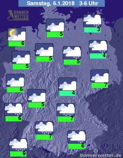 Am Samstag halten sich überwiegend dichte Wolken aus denen auch zeitweise Regen fällt. Im Süden und auch über Sachsen zeigt sich hingegen im Tagesverlauf häufig die Sonne und es ziehen hier mehrheitlich nur lockere bis aufgelockerte Wolken durch, dazu bleibt es auch meist trocken. Die Temperatur erreicht 6 bis 12 Grad.