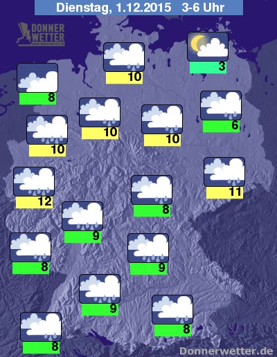 In der Nacht zum Dienstag bleibt der Himmel überwiegend bedeckt, vor allem im Norden sind aber auch Auflockerungen mögilch, hier bleibt es auch oft trocken, sonst fällt hingegen teils langanhaltender Regen. Die Temperatur sinkt auf 12 Grad in Köln und bis etwa 3 Grad an der Müritz. An den Küsten und über der Südhälfte des Landes weht ein oft starker bis stürmischer Wind, dabei sind auch schwere Sturmböen möglich.