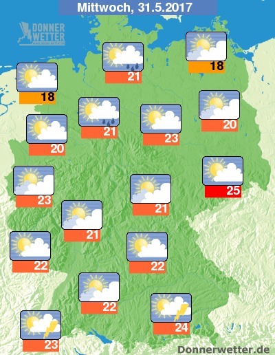 Ganz im Süden halten sich dichtere Wolken mit einigen Regengüssen, örtlich entstehen mit etwas sonniger Einstrahlung auch Gewitter. Sonst wechseln sich Sonne und Wolken miteinander ab und es bleibt überwiegend trocken, nach Norden ist es auch längere Zeit sonnig. Die Temperaturen bewegen sich nach der großen Hitze der vergangenen Tage bei angenehmeren 20 bis 27 Grad. Noch kühler ist es an der Küste von Nord- und Ostsee, sowie auf den Inseln und Bergen.