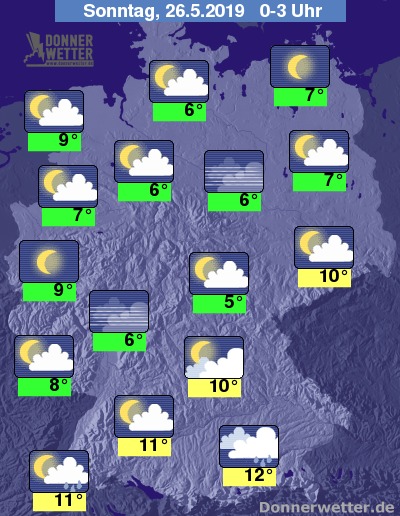 In den Nachtstunden zeigt sich der Himmel meist locker oder aufgelockert bewölkt, vor allem in der Süd- und Osthälfte Deutschlands kann sich im Nachtverlauf Nebel bilden. Südlich der Donau fallen anfangs noch letzte Schauer, die im Verlauf der zweiten Nachthälfte aber abklingen.
