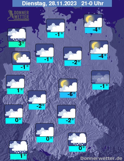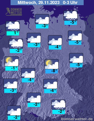 In der nacht auf Mittwoch zeigt sich der Himmel bis auf einzelne Auflockerungen stark bewölkt oder es ist bedeckt. Dabei breiten sich von Nordwesten her leichte bis mäßige Schneeschauer aus, die bis in die frühen Morgenstunden auch die nördliche Mitte und die Westhälfte erreichen. Weitere Schneefälle auch an der Ostseeküste sowie am Alpenrand. Verbreitet muss mit Glätte gerechnet werden!