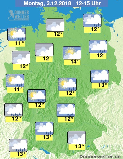 Die Temperaturen bewegen sich bei Werten um 11 Grad C in Emden und um 14 Grad C im Rheinland.