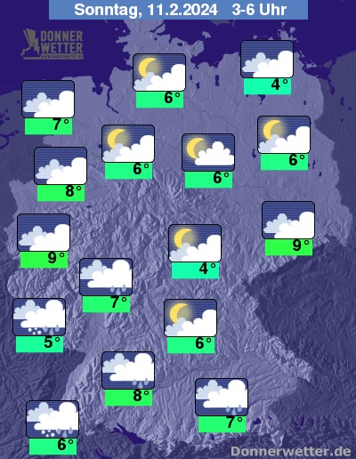 Die Temperaturen erreichen am Nachmittag Werte um 4 Grad im Norden Mecklenburg-Vorpommerns und sehr milde 14 Grad im Rheinland. An den Alpen bei Föhn teilweise Werte um 16 bis 18 Grad.