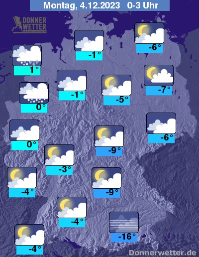 Die Temperaturen liegen in der Nacht im Westen bei Werten teils über dem Gefrierpunkt, sonst Tiefstwerte um -1 bis -9 Grad. Am Alpenrand über Schnee teils Werte unter -15 Grad.