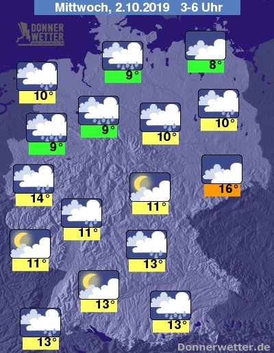 In der Nacht ist der Himmel meist stark bewölkt oder bedeckt, einzelne Auflockerungen sind meist nur über Teilen Thüringens sowie im äußersten Südwest zu erwarten. Vielerorts muss in der Nacht mit Schauern gerechnet werden, im Süden und Nordwesten fällt teils auch kräftigerer Regen.