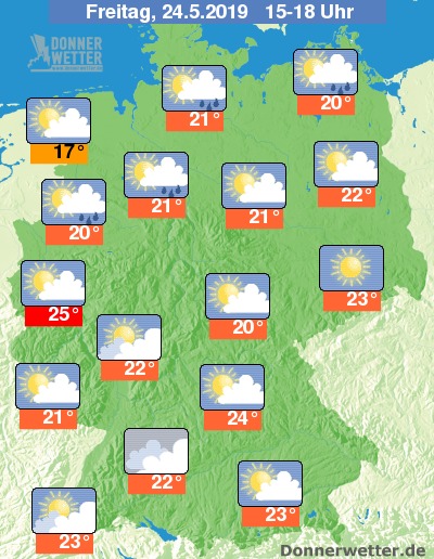 Die Temperaturen liegen zwischen 17 und 21 Grad im Nordwesten und an der See. Sonst können angenehm warme 21 bis 25 Grad erreicht werden.