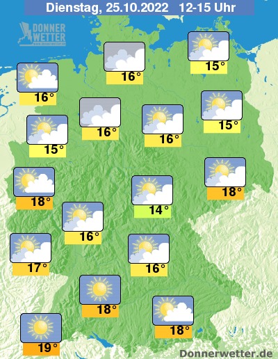 Heute Nachmittag scheint besonders im Süden die Sonne häufig, im übrigen Land ist es teils stark, teils locker bewölkt, dabei bilden sich nur selten Schauer. Die Temperatur liegt bei 14 Grad im Vogtland und bis 19 Grad im Breisgau.
