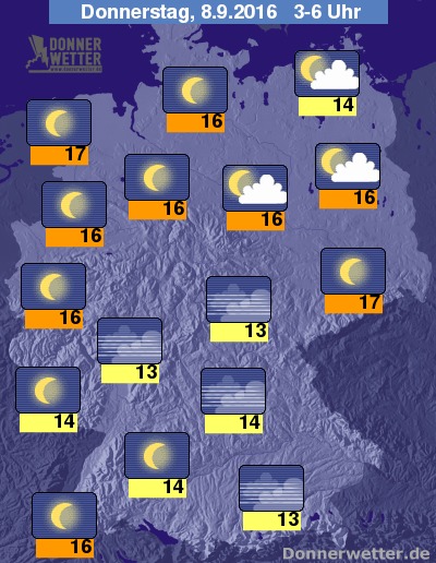 In der Nacht zum Donnerstag ist der Himmel über der Republik größtenteils sternenklar. Einige, jedoch weitgehend nur lockere Wolken ziehen über den Nordosten des Landes hinweg, dazu bleibt es trocken. Die Temperatur sinkt auf 17 Grad an der Wesermündung und bis 13 Grad in München.