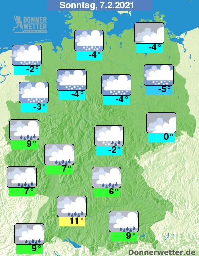 Heute bleibt es über der Nordhälfte bedeckt und es fällt immer wieder, zum Teil kräftiger Schnee, dabei weht ein oft stürmischer Wind. Zur Landesmitte hin fällt verbreitet Regen, teils auch Schneeregen oder Eisregen. Es besteht erhöhte Glättegefahr! Im Süden ist es bedeckt und es fällt gebietsweise Regen. Die Temperatur steigt auf eiskalte -5 Grad im Berliner Umland und bis zu 11 Grad im Raum Stuttgart.