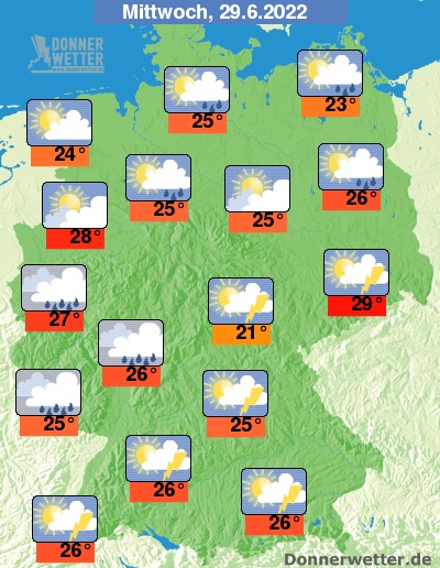 Am Mittwoch ist es über dem Norden und Westen meist heiter bis sonnig, vereinzelte Schauer sind jedoch nicht auszuschließen. Im übrigen Land ist es größtenteils stark bewölkt und es bilden sich vielerorts Schauer sowie örtliche Gewitter. Die Temperatur steigt auf 21 Grad in Erfurt und bis 29 Grad in Dresden.