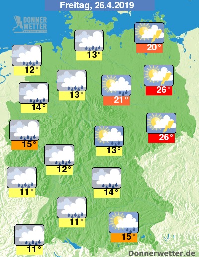 Der Freitag ist im Westen meist grau und verregnet. Im Tagesverlauf muss auch zeitweise mit langanhaltenden Regenphasen gerechnet werden. Im Osten scheint dagegen oft noch lange die Sonne allerdings besteht mit dem Aufzug der Schauerwolken auch Gewittergefahr. Die Temperaturen erreichen kühle 12 Grad im Ostfriesland und bis zu 26 Grad in Brandenburg.