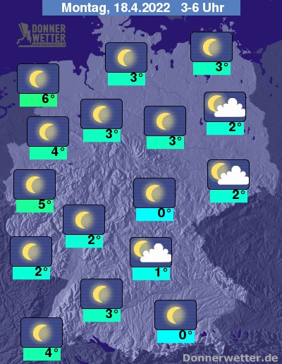 In der Nacht zum Montag ist der Himmel überwiegend sternenklar, weiter nach Osten hin ist auch lockere Bewölkung möglich, dazu bleibt es trocken. Die Temperatur sinkt auf 6 Grad an der Nordsee und bis 0 Grad im Berchtesgadener Land.