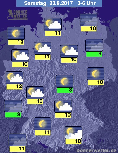 In der folgenden Nacht erwarten wir einen oft sternenklaren und sonst nur locker bewölkten Himmel, dazu bleibt es trocken. Die Temperatur sinkt auf Werte zwischen 13 Grad in Emden und bis etwa 8 Grad im Grabfeld.