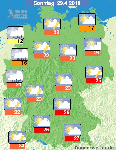 Am Sonntag zeigt sich das Wetter vor allem über der Osthälfte der Republik überwiegend heiter bis sonnig. In den westlichen Landesteilen ist es zu Beginn noch teils heiter, jedoch bilden sich hier im Tagesverlauf vielerorts Schauer und örtlich auch Gewitter. Weiter nach Osten hin besteht nur ein leichtes Schauer- und Gewitterrisiko. Die Temperatur steigt auf kühle 12 Grad an der Nordsee und auf sommerliche 27 Grad in München.
