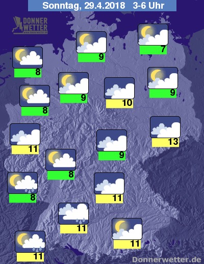 In der Nacht zum Sonntag ziehen im Südwesten dichte Wolken mit Schauern auf, die sich im Verlauf auch auf den übrigen Süden Deutschlands hin ausbreiten. Weiter nach Norden hin ist es auch oft stark, teils aber auch locker bis aufgelockert bewölkt, dazu bleibt es trocken. Die Temperatur sinkt auf 13 Grad in Dresden und bis 7 Grad in Neubrandenburg.