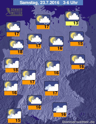 In der folgenden Nacht zeigt sich der Himmel über dem Osten und Nordosten der Republik meist locker bewölkt und dazu bleibt es hier trocken. Im großen Rest des Landes ist es hingegen überwiegend aufgelockert, nicht selten auch stark bewölkt und es sind hier und da auch einzelne Schauer, vereinzelt auch Gewitter möglich. Die Temperatur sinkt auf 18 Grad im Ruhrgebiet und bis 13 Grad an der Müritz.