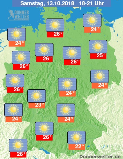 In der Nacht zum Sonntag zeigt sich der Himmel weitgehend sternenklar, lediglich in den westlichen und südwestlichen Landesteilen ziehen örtlich einige Wolken durch, dazu bleibt es trocken. Besonders in den Flussniederungen und in Tallagen bildet sich stellenweise Nebel. Die Temperatur sinkt auf 16 Grad an der Nordsee und bis 10 Grad im Thüringer Becken.
