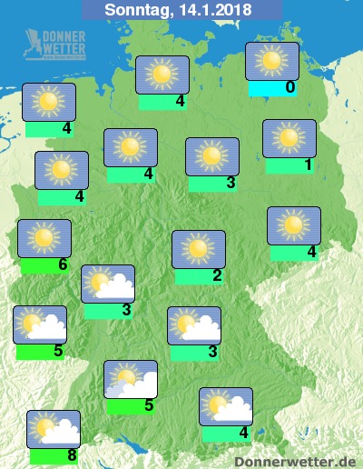 Heute ist es verbreitet heiter oder sonnig, einige, jedoch überwiegend nur lockere Wolken ziehen über den Südwesten und Süden Deutschlands hinweg, dabei bleibt es trocken. Die Temperatur steigt auf 0 Grad an der Müritz und bis 8 Grad im Breisgau.