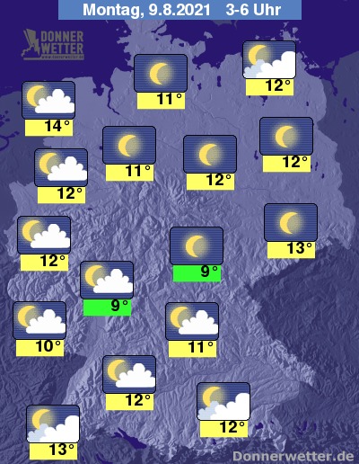 In der bevorstehenden Nacht ist es im Südosten und im Nordosten Deutschlands oft stark, teils auch dicht bewölkt, dazu bleibt es aber weitgehend trocken. Im übrigen Bundesgebiet ist es locker bewölkt, oft ist es auch sternenklar, dazu bleibt es trocken. Die Temperatur sinkt auf 14 Grad im nördlichen Emsland und bis 9 Grad im Vogtland.