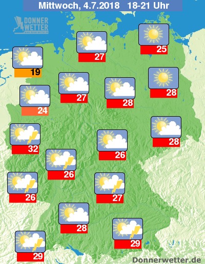 Heute Abend ist es an der Nordsee teils stark, teils aufgelockert bewölkt, aber meist trocken. Über der übrigen Nordhälfte ist es überwiegend heiter bis sonnig, hier und da auch mal wechselnd bewölkt, jedoch weitgehend trocken. Im Süden können sich bei wechselnder bis starker Bewölkung gebietsweise Schauer und vereinzelt auch Gewitter entwickeln. Die Temperatur liegt bei 19 Grad an der Nordsee und bis 32 Grad im Rheinland.