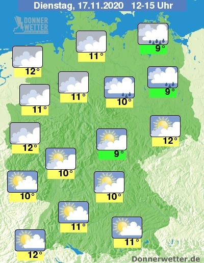 Am frühen Nachmittag zieht Warmfrontregen in den Nordosten. Sonst halten sich im Norden unseres Landes oft dichte Schichtwolken mit vereinzeltem Sprühregen. In der Südhälfte lässt sich zwischen den Wolken auch gelegentlich die Sonne blicken. Lokal können sich aber auch zähe Nebelfelder halten.