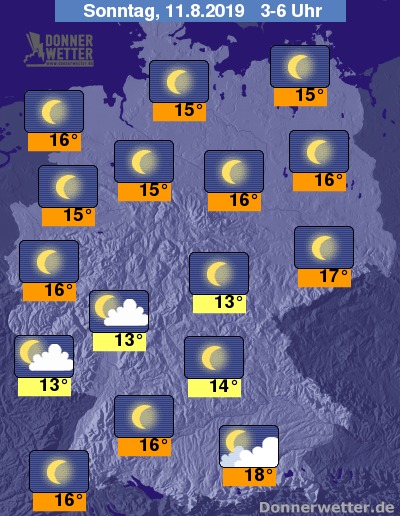 In der Nacht zum Sonntag ist der Himmel über dem Land größtenteils sternenklar, anfangs können an der Nordsee und im Südosten noch teils dichte Wolken mit letzten Tropfen durchziehen, anschließend sind zumindest im Süden noch einige Wolkenfelder möglich, dazu bleibt es trocken. Die Temperatur sinkt auf 18 Grad in München und bis 13 Grad im Eichsfeld.