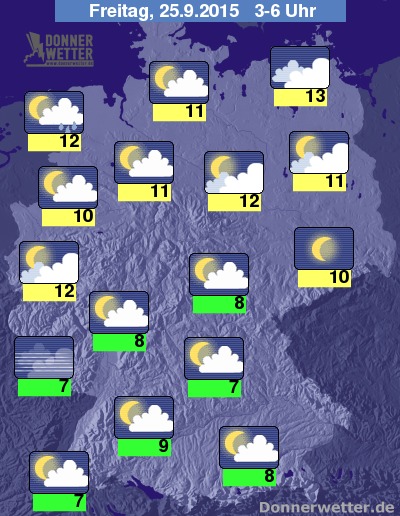 In der Nacht zum Freitag fällt im Nordwesten unter teils dichten Wolken noch gebietsweise Regen, sonst ist es hingegen verbreitet locker bis aufgelockert bewölkt und nur selten zieht auch mal starke Bewölkung durch, dabei bleibt es trocken. Die Temperatur sinkt auf 13 Grad in Rostock und bis etwa 7 Grad am Pfälzer Wald. Im Westen und Südwesten bildet sich stellenweise Nebel oder Hochnebel.