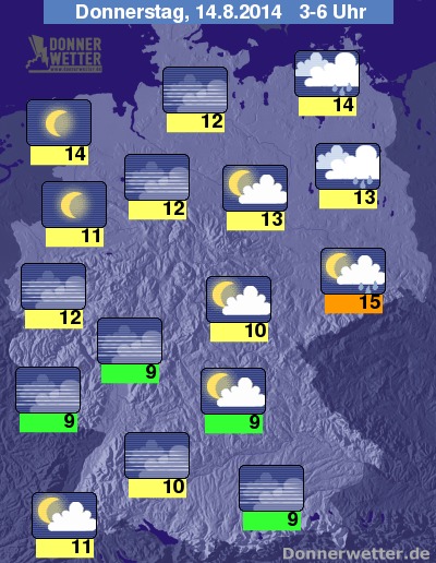In der kommenden Nacht fällt, unter meist dichten Wolken, vor allem nach Osten hin noch zeitweise Regen, dieser zieht sich jedoch mehr und mehr weiter nach Osten zurück, so dass es gegen Morgen voraussichtlich nur noch im Raum Berlin-Brandenburg gebietsweise regnen wird. Sonst lockert die Bewölkung von Westen immer weiter auf, und besonders in der zweiten Nachthälfte wird es vielerorts auch klar. Die Temperatur sinkt auf 15 Grad in Dresden und kühle 9 Grad im Spessart.